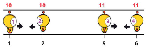 然而,由于机器人们的移动路径交叉,往左 (L) 或往右 (R) 移动,它们可能会发生碰撞。一旦两个机器人在相同的位置相遇,它们就会发生碰撞。