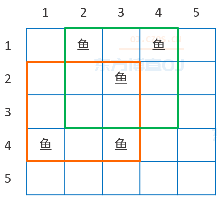 样例 1 每条鱼的坐标如下图所示,可以用橙色或者绿色的边长为 3 \times 3 的正方形网,抓住 3 条鱼。