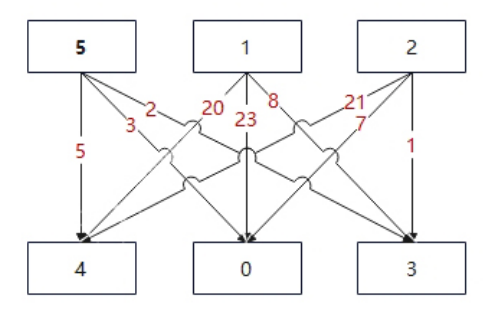 cost[0][0]=9、cost[0][1]=8,分别代表:数值 0 移动到下一行 j=0 的列代价为 9、移动到下一行 j=1 的列代价为 8。
