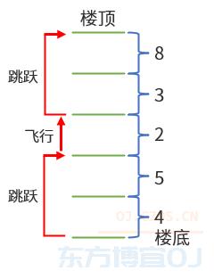 共有 5 层楼,从楼底先开启跳跃模块,跳跃到 3 楼,然后开启飞行器飞跃 3 楼需要的时间为 2,然后再次开启跳跃模块,跳跃到 5 楼(顶楼) 的屋顶。