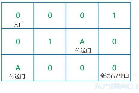 为了保护魔法石,迷宫内还有一些位置被施了魔法,成为传送门,走到一对传送门的其中一个位置,会被立刻传送到这对传送门的另一个位置,传送过程不消耗时间。
